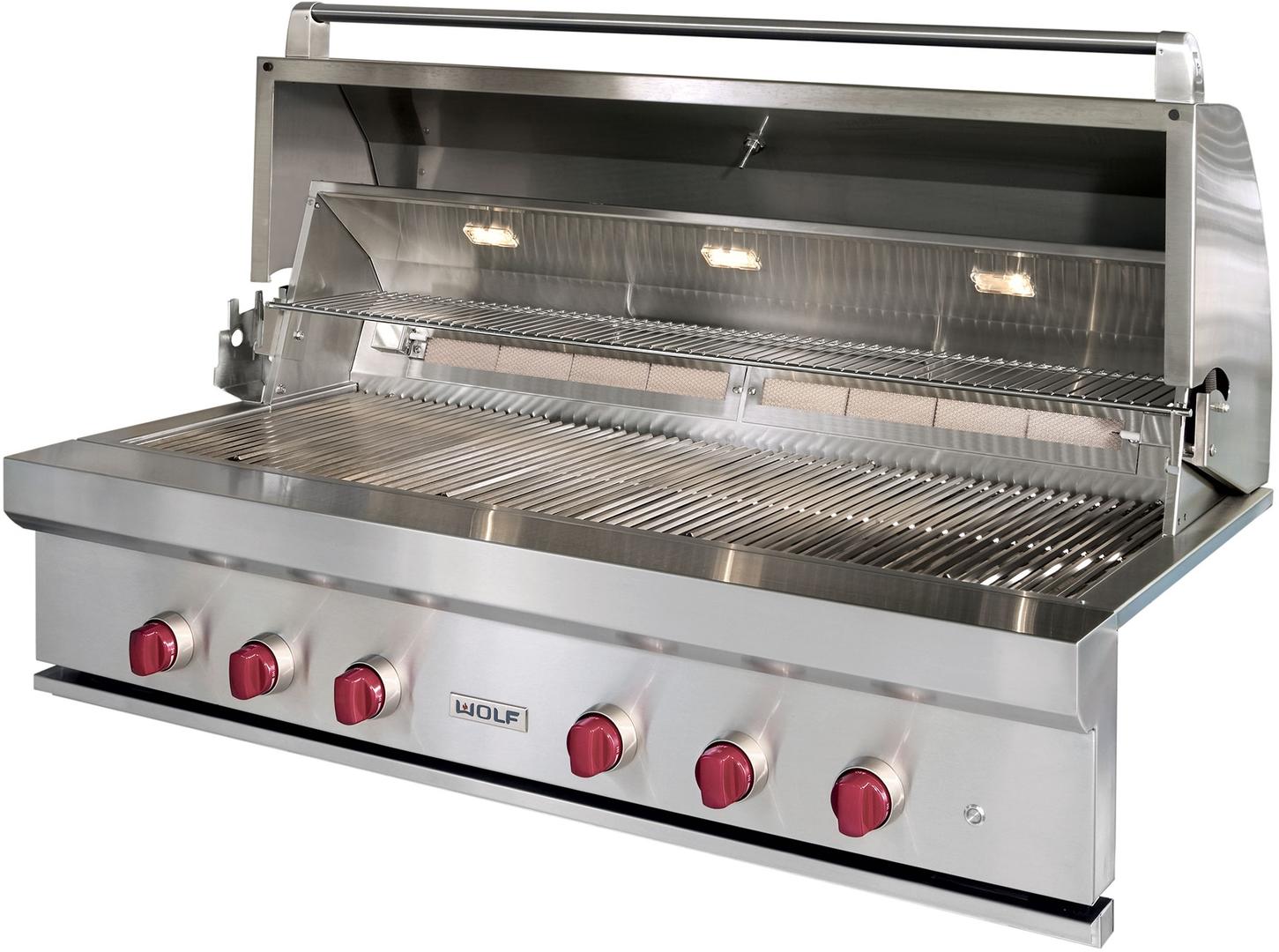 Signature red control knobs are LED lit for night grilling